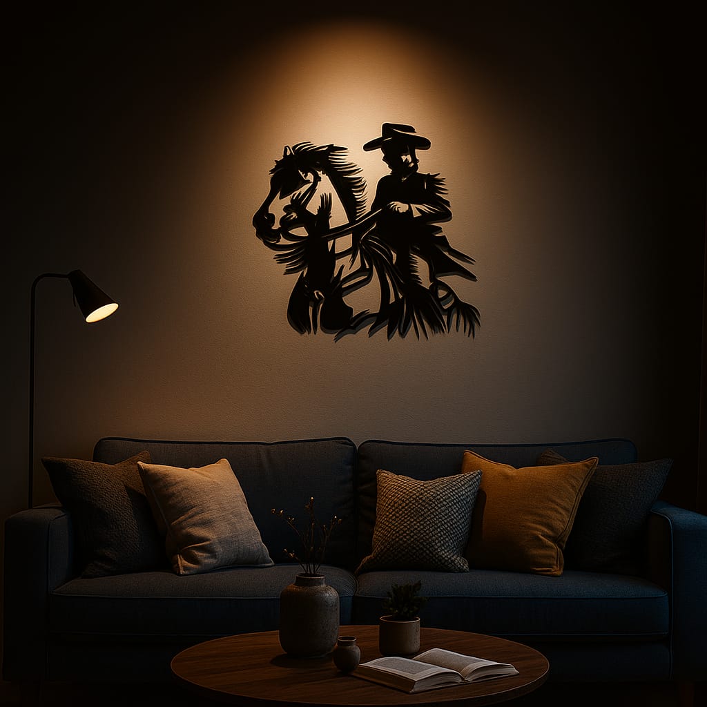 Add a touch of Western charm to your home with the Cowboy Rider Wall Art. Crafted from high-quality acrylic, this bold silhouette of a cowboy on horseback captures strength, freedom, and adventure. Perfect for living rooms, offices, or cafés, it blends rustic spirit with modern elegance to transform any wall into a statement piece.